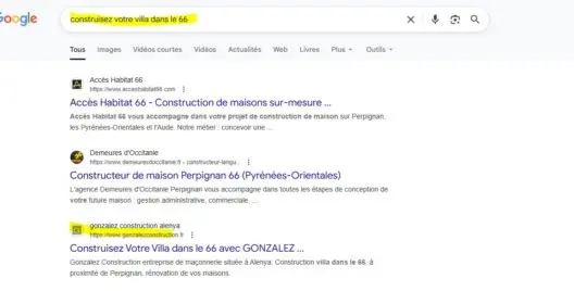 exemple client qui est sur la première page de google avec les mots clés : "construisez votre villa dans le 66": voir ci dessous à droite capture écran google,