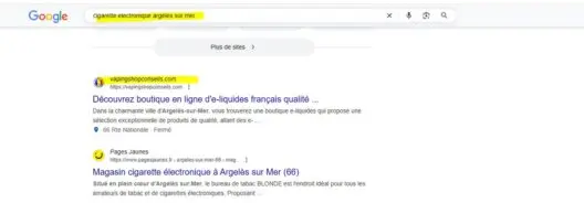 Exemple de client qui est numéro un sur la première page de google sur le plan local en e-commerce avec le mot clés : e-cigarette électronique Argeles " ou "e-liquide Argeles sur mer" voir ci dessous capture écran google