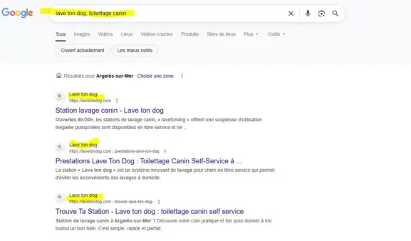 Numéro un sur google. voir capture écran exemple à gauche pour le site dont vous avez l'image ci dessus qui est sur la première page de google avec les mots clés : "lave ton dog, toilettage canin"